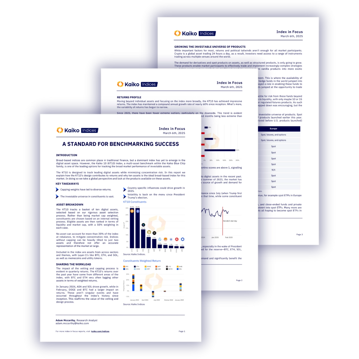 Index in Focus: A Standard for Benchmarking SuccessDownloadThis week, we’re analyzing the Kaiko 10 Index (KT10), part of our multi-asset Blue Chip crypto indices. With a compound annual growth rate of nearly 60% since inception, the index offers competitive returns that capture the broader markets performance without sacrificing.