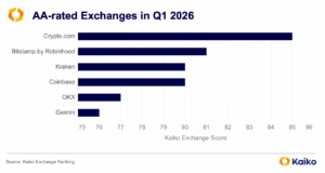 The AA tier currently comprises the highest-rated platforms in the Kaiko ranking, based on an overall score from 0 to 100 (best). In the Q1 2026 ranking, the AA tier is dominated by Crypto.com, Bitstamp by Robinhood, Kraken, Coinbase, OKX, and Gemini.