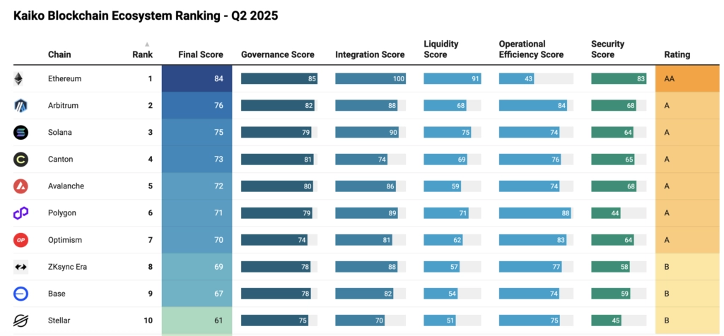 “Our Blockchain Ecosystem Ranking is designed to bring clarity and transparency to a fragmented and complex market, giving decision-makers a robust framework for selecting the most suitable blockchain infrastructure for their needs,” said Ambre Soubiran, CEO of Kaiko.