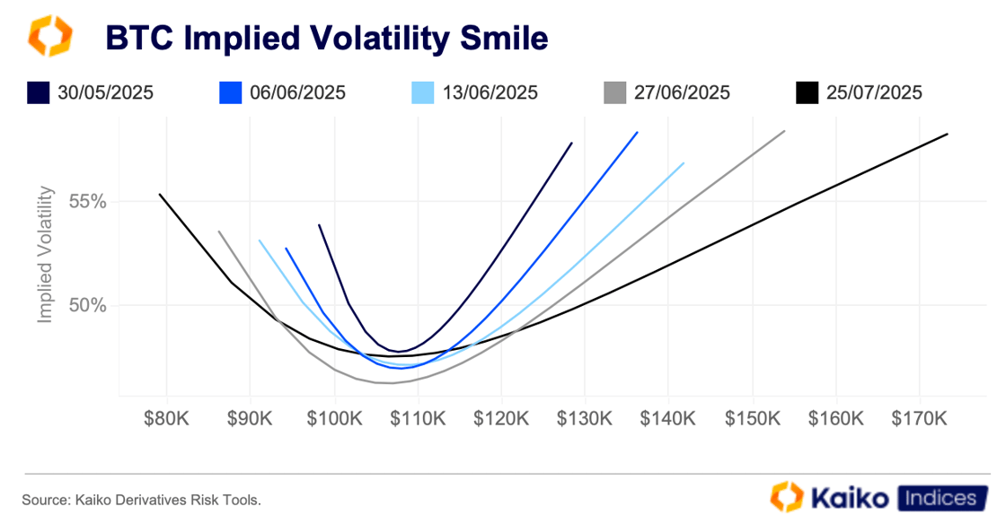 This kind of trading activity is reflected in Bitcoin’s implied and realized volatility profiles. Implied volatility for BTC options contracts on Deribit displays more of a volatility smile than a skew, since prices are often just as likely to move dramatically in either direction. This increases demand for out-of-the-money calls and puts.