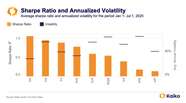 However, the impact on BTC’s cost to trade measured by the bid-ask spreads, has been mixed. Initially, spreads on top US exchanges — Coinbase, Bitstamp, and Kraken — narrowed following the launch of spot ETFs. Nonetheless, they widened again in March as volatility rose and Bitcoin reached an all-time high before declining again in Q2.