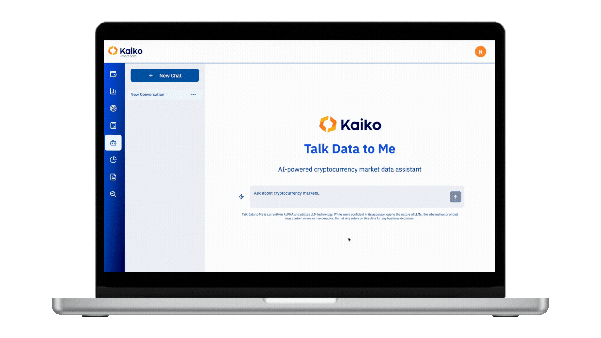 Offered as part of Kaiko Research Premium, Talk Data to Me lets you access crypto market data by asking simple questions. It’s trained to use Kaiko’s market data for maximum accuracy. Get valuable information such as prices, liquidity, volumes, order books, and market activity. No complicated APIs – uncover data-driven insights faster than ever.